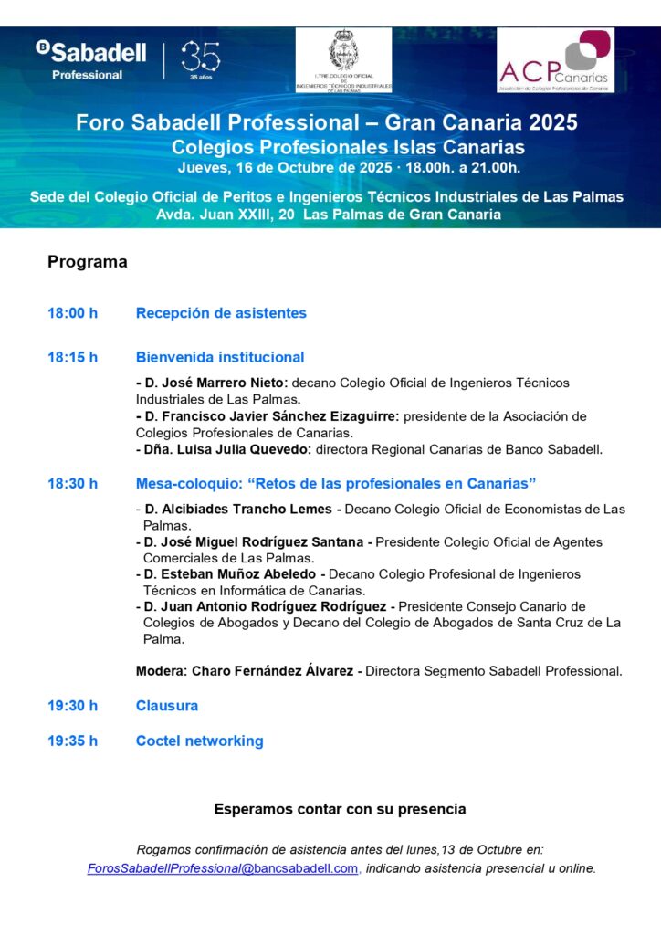 El Foro Sabadell Professional Gran Canaria 2025, organizado por Colegios Profesionales Islas Canarias y Banco Sabadell, tendrá lugar el jueves 16 de octubre, de 18:00 a 21:00 horas, en la sede del Colegio Oficial de Peritos e Ingenieros Técnicos Industriales de Las Palmas de Gran Canaria.