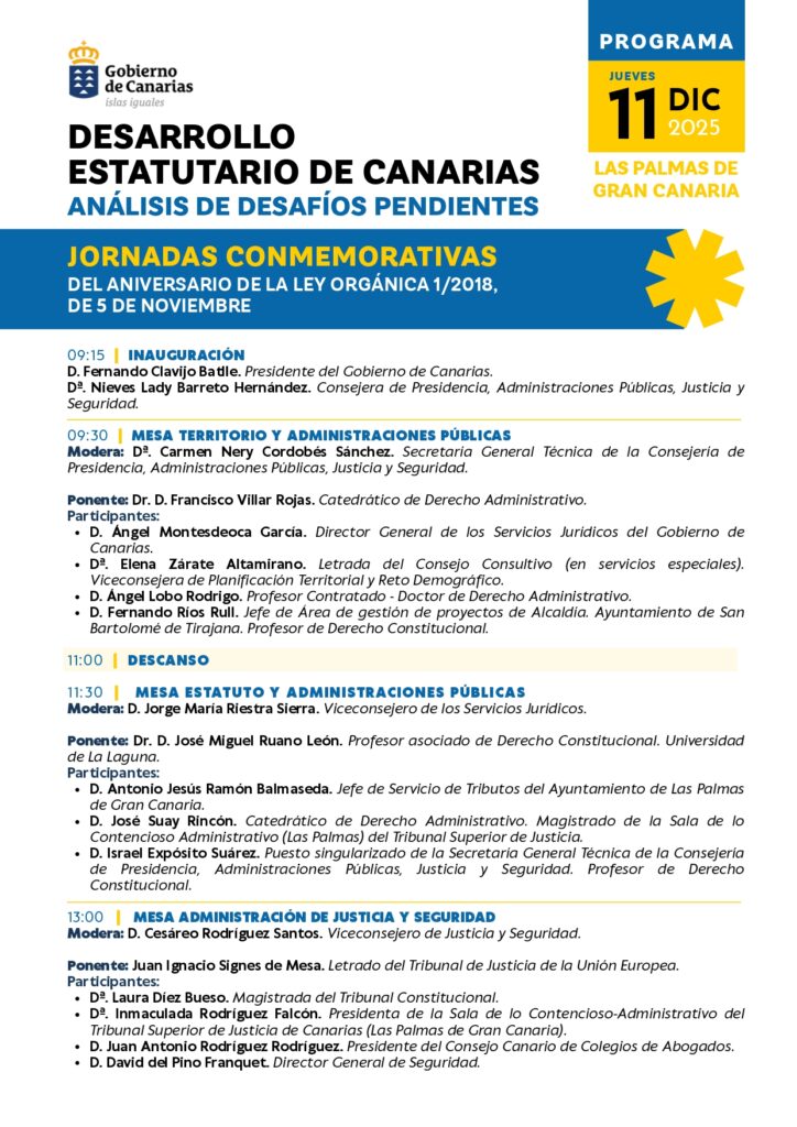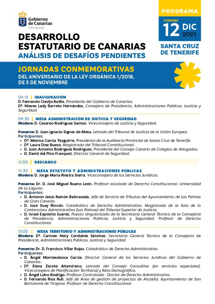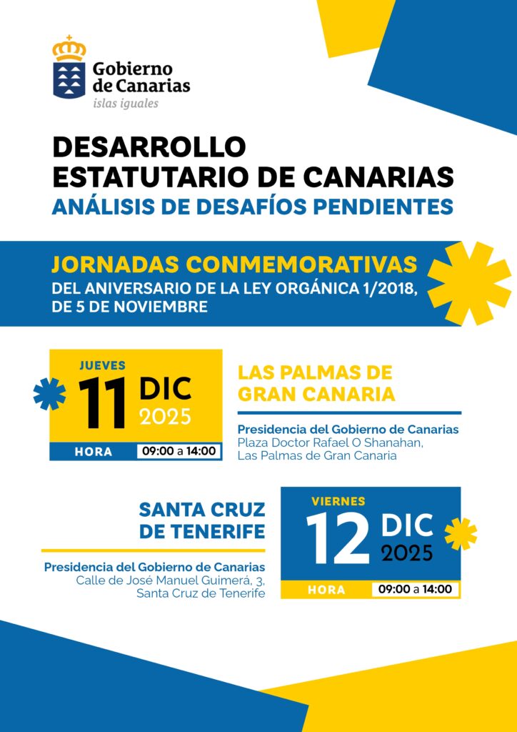 El Gobierno de Canarias fomenta la reflexión y el debate crítico sobre el desarrollo estatutario de Canarias con unas jornadas conmemorativas del aniversario de la Ley Orgánica 1/2018, de 5 de noviembre, enfocadas en avanzar en los desafíos pendientes de nuestra autonomía y que se celebrarán los días 11 y 12 de diciembre, en Las Palmas de Gran Canaria y Santa Cruz de Tenerife.
