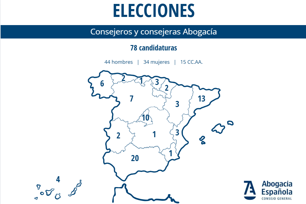 Se trata del mayor número de candidaturas presentado hasta la fecha en la historia de la Abogacía Española. Los aspirantes son 44 abogados y 34 abogadas, procedentes de 15 comunidades autónomas.